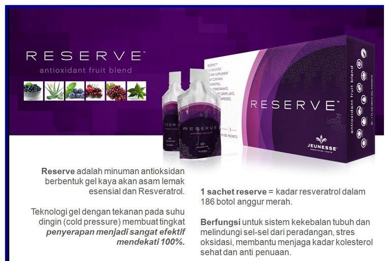 Anda dapat menemukan testimoni pengguna Reserve yang antara lain dapat juga Anda baca di sini. Sebagian manfaat RESERVE™ di atas menjadikan produk ini sebagai pilihan utama banyak pengguna dengan beragam usia di berbagai negara dalam menjaga vitalitas tubuh dalam beraktivitas. Reserve adalah campuran buah acai, delima, blueberry murni, jus ceri hitam manis dan teh hijau, tanpa kandungan kimia sehingga sangat aman bagi tubuh kita.